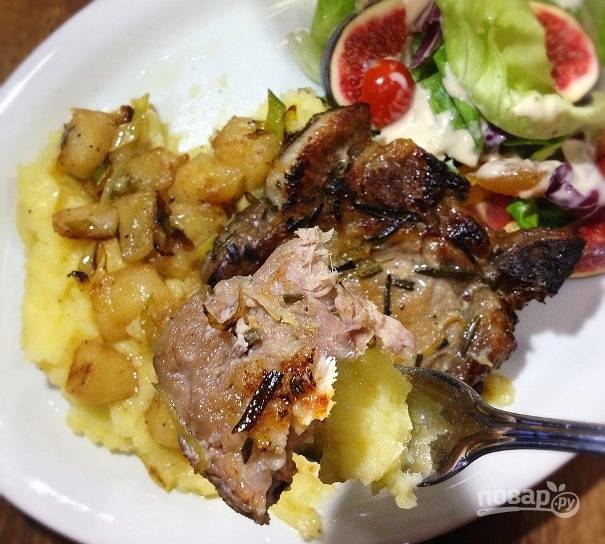 Выложите яблоки на тарелку, а сверху добавьте кусок мяса. Подавайте горячим с картофельным пюре на гарнир!