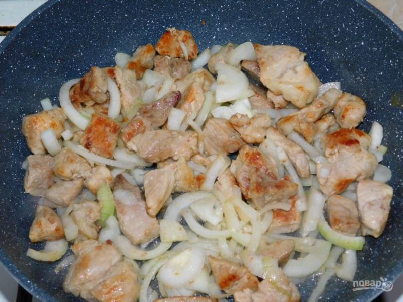 Добавьте нарезанный лук. Продолжайте обжаривать все вместе еще пару минут. Посолите.