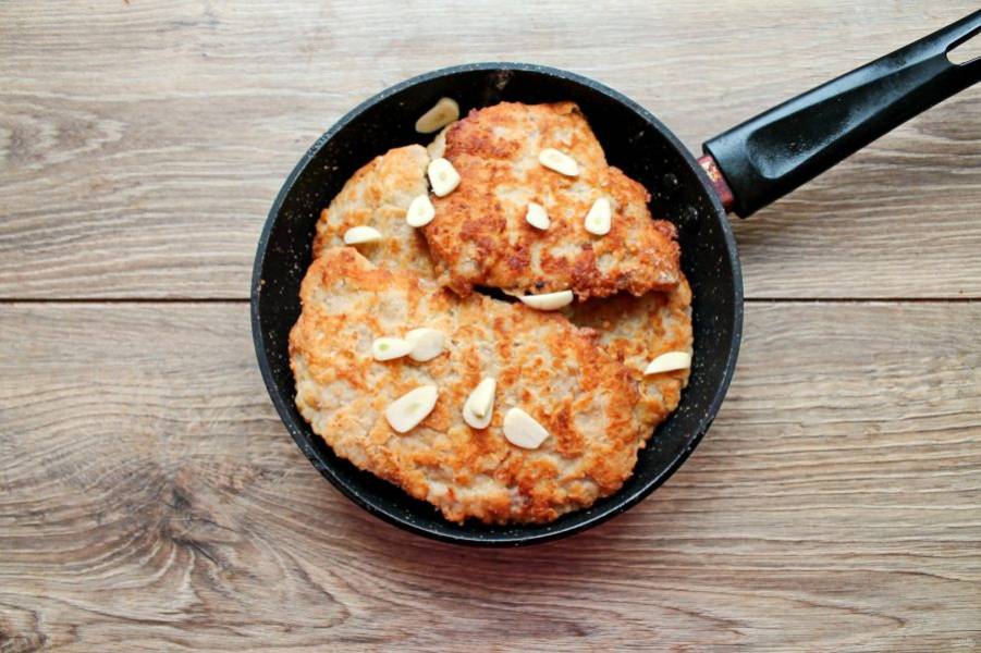 Выложите обжаренные куски мяса в сковороду и влейте немного воды. Чеснок очистите и порежьте на слайсы, выложите в сковороду. Готовьте на медленном огне под крышкой еще 10-15 минут.