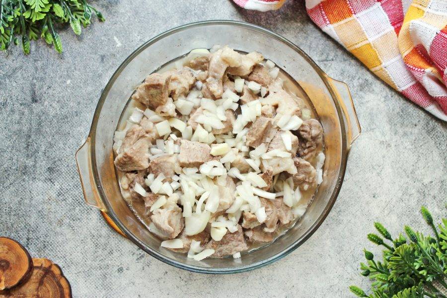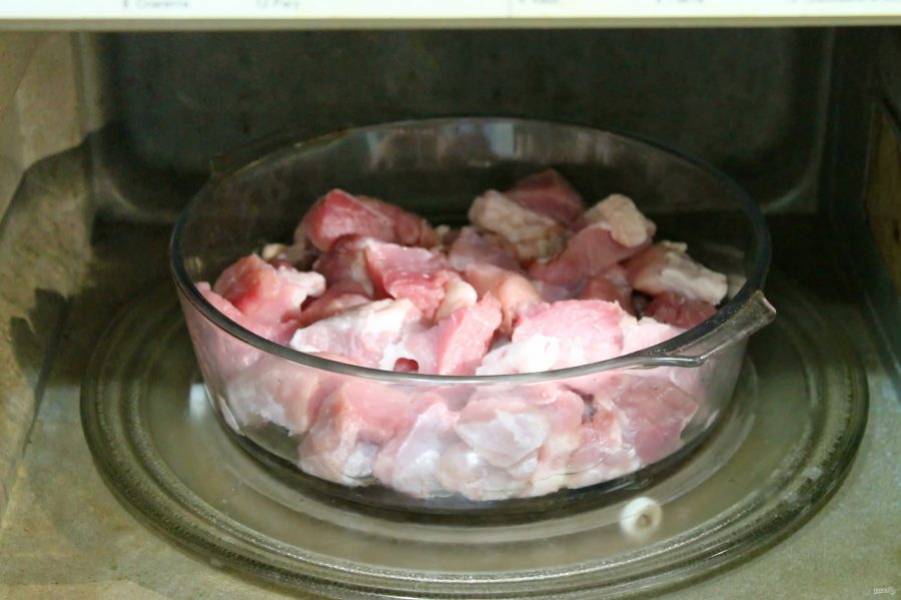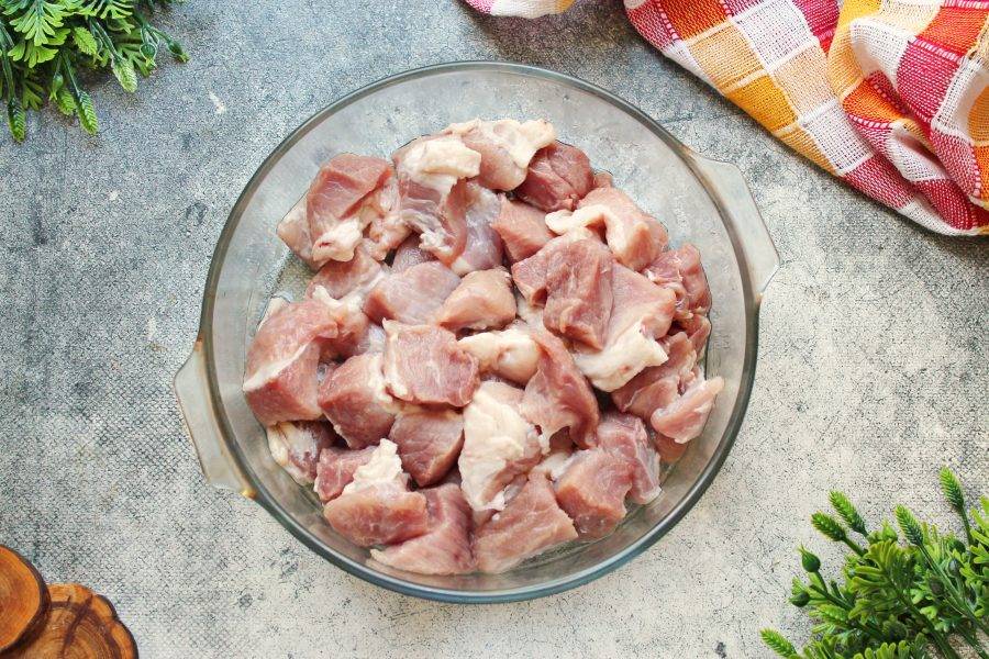Свинину вымойте в холодной воде и промокните бумажными салфетками. Порежьте мясо средними кусочками и выложите в посуду для микроволновой печки, смазанной растительным маслом.