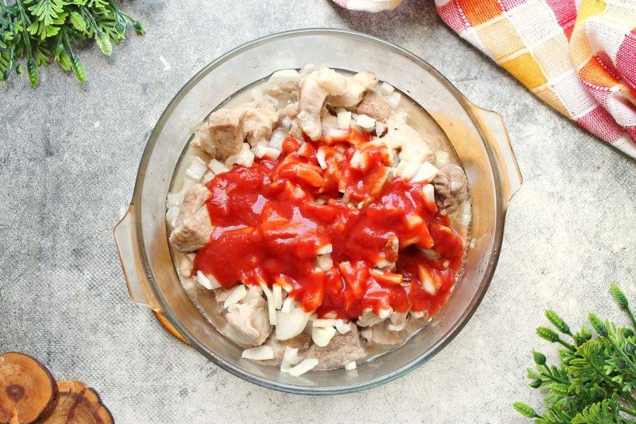 Помидор разрежьте пополам, натрите на крупной терке, шкурки удалите. Добавьте помидоры к свинине с луком.