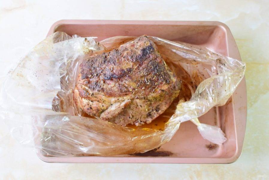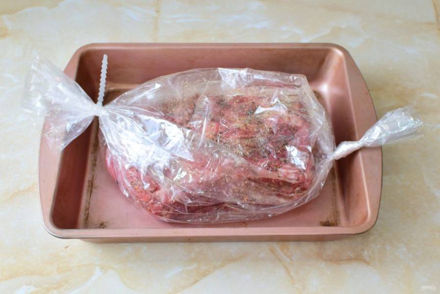 Завяжите пакет с двух сторон, чтобы мясо осталось внутри. Выложите в металлическую форму для запекания и поставьте в духовку, предварительно разогретую до 180 градусов, примерно на 1,5 часа.