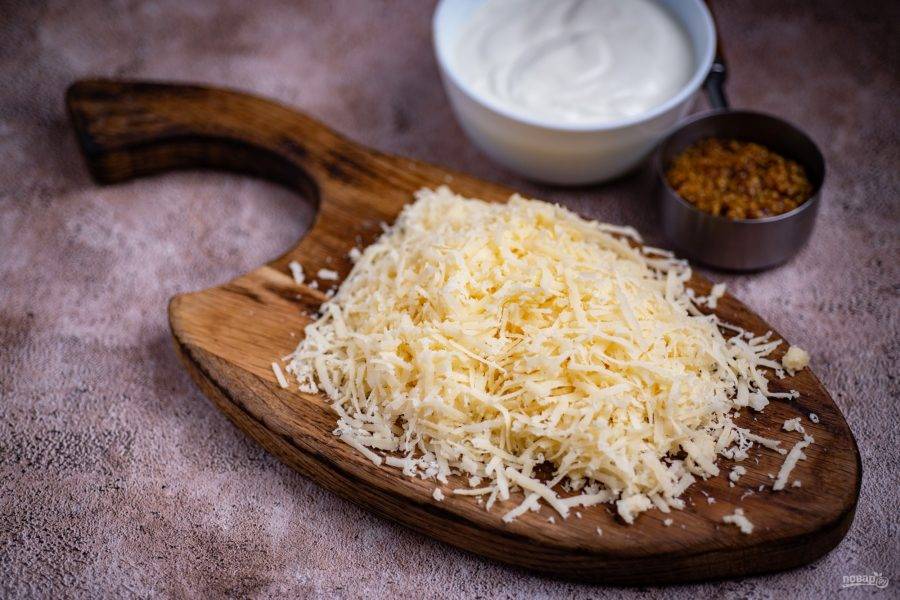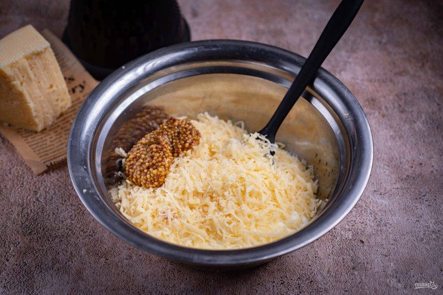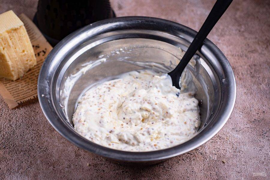 В миску выложите сметану, горчицу и тертый сыр.