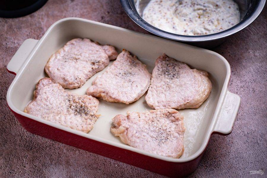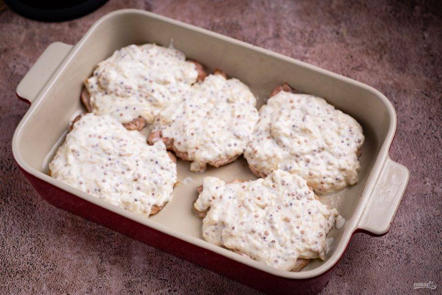 Каждый стейк обильно покройте сметанным соусом. Форму отправьте в разогретую духовку и готовьте в течение 20 минут.