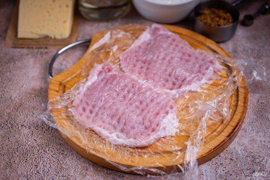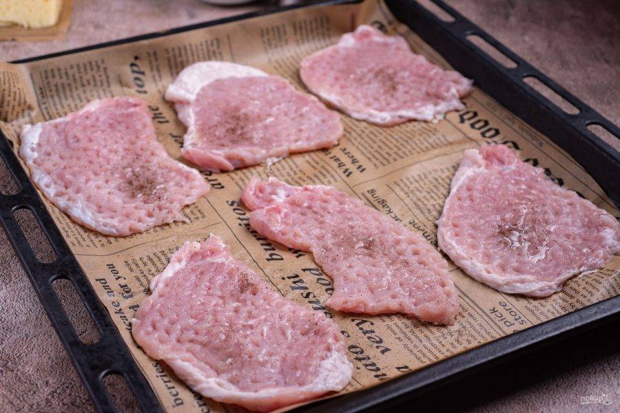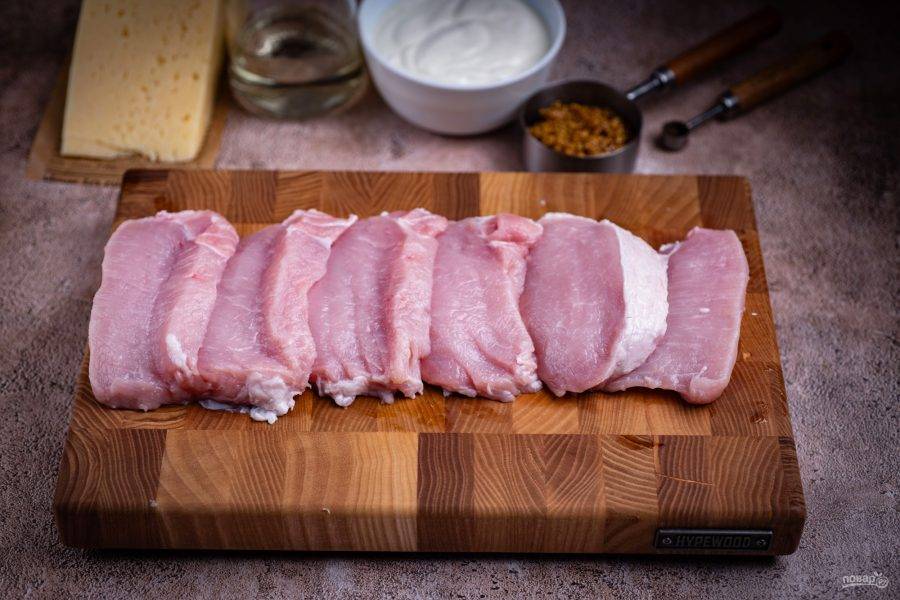 Нарежьте свинину стейками толщиной примерно в 1 см.