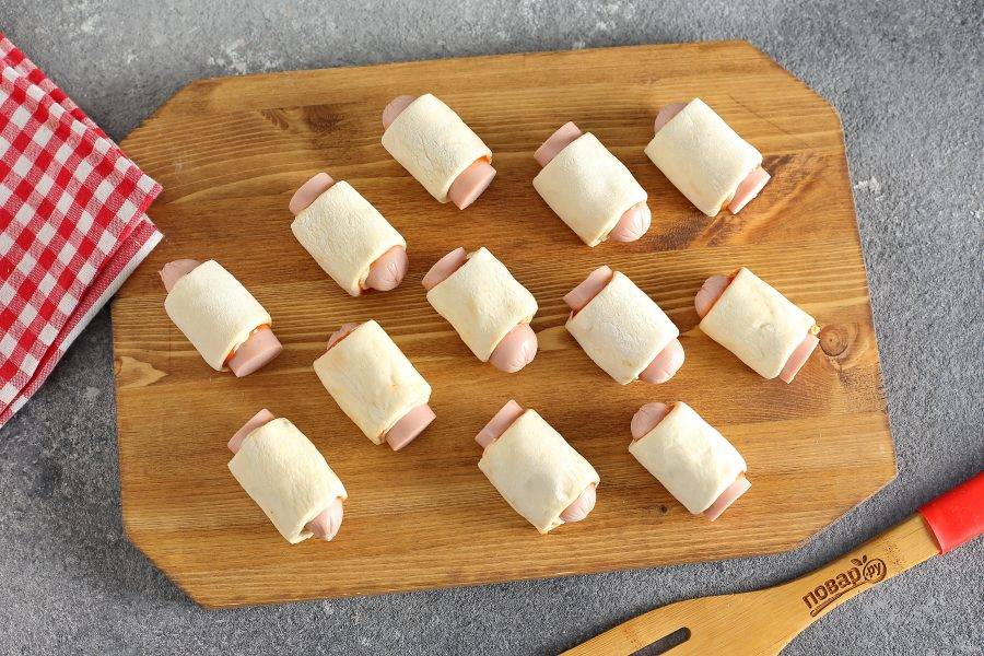 Тесто раскатайте в форме прямоугольника, толщиной 2-3 мм. Разрежьте тесто на полоски такой ширины, чтобы они получились немного уже, чем сами сосиски.
