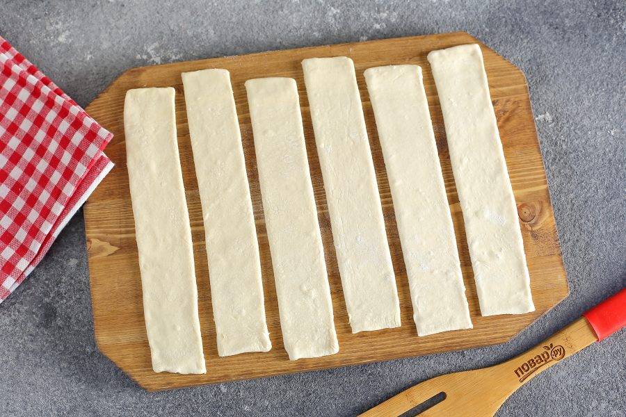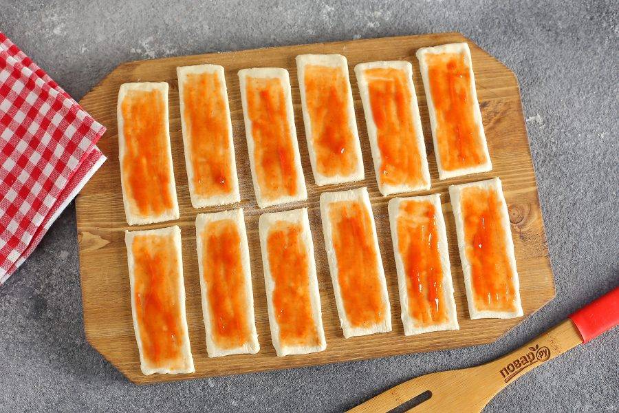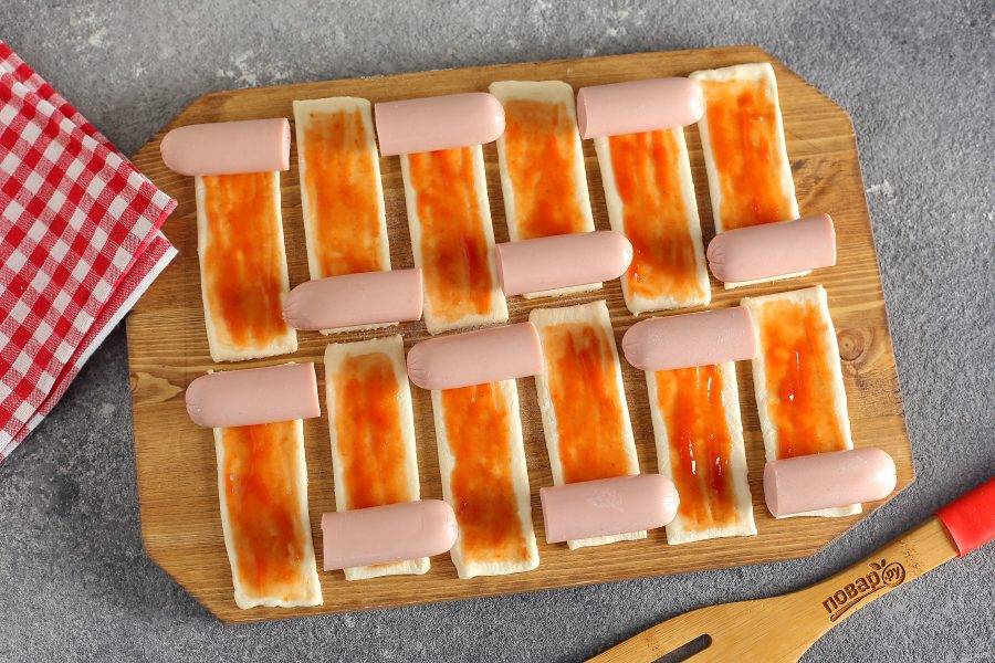 Затем каждую полоску теста разрежьте пополам и смажьте кетчупом или горчицей.