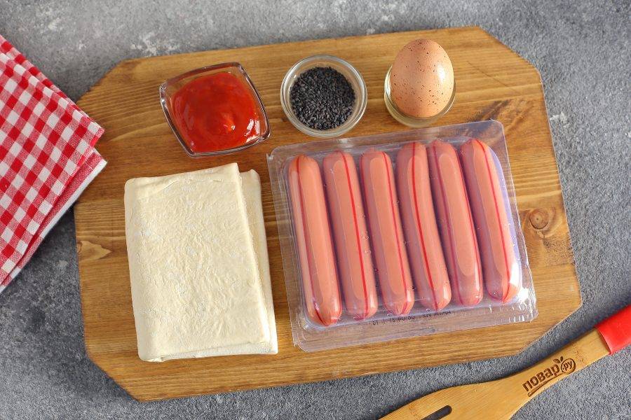 Подготовьте все ингредиенты. Тесто заранее разморозьте при комнатной температуре.