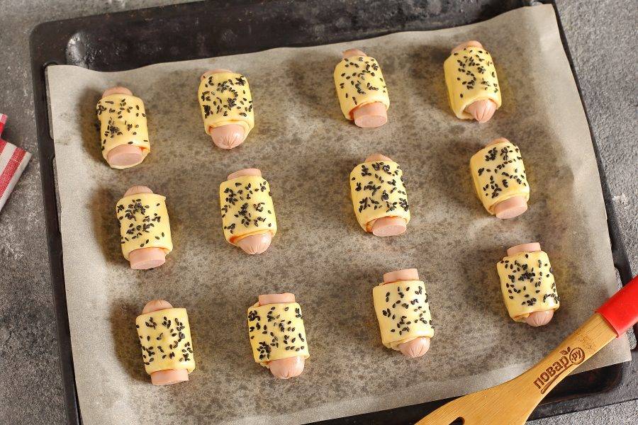 Выложите заготовки швом вниз на противень, застеленный пергаментом. Пекарскую бумагу можно смазать предварительно маслом. Смажьте верх теста желтком и посыпьте кунжутом. Запекайте в духовке при температуре 180 градусов около 20 минут. Верх должен подрумяниться.