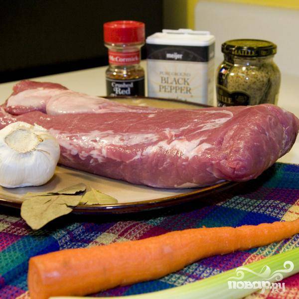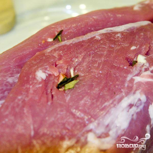 С помощью ножа сделать глубокие отверстия в мясной вырезке. Заполнить каждое отверстие смесью чеснока, сельдерея, лаврушки и морковки.