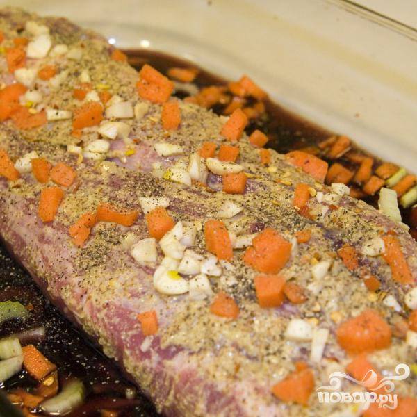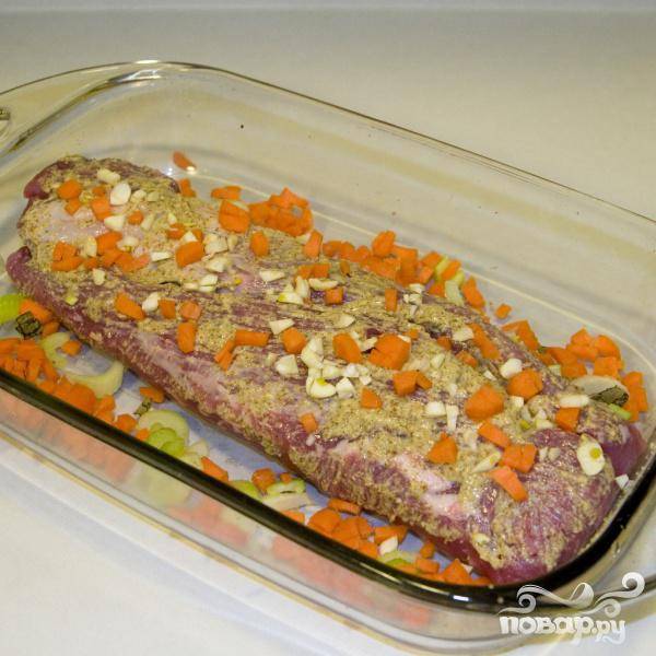 Поместить вырезку в термостойкую форму для выпечки. Полить горчицей, посыпать рубленым чесноком, морковью и остатками сельдерея.