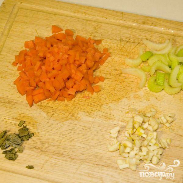 Мелко нарезать чеснок, почистить и покрошить морковь, лук, лавровые листья.