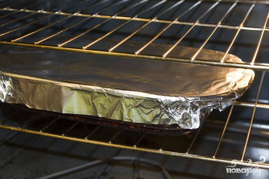 Нагреть духовку до 200 C. Закрыть блюдо с вырезкой фольгой. Выпекать 30 минут.