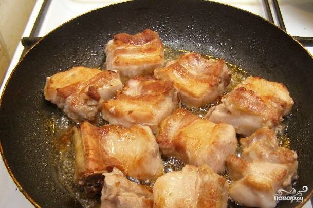Обжарьте ребрышки на сковороде на сильном огне до образования аппетитной корочки с двух сторон. Переложите их в сотейник с толстым дном.