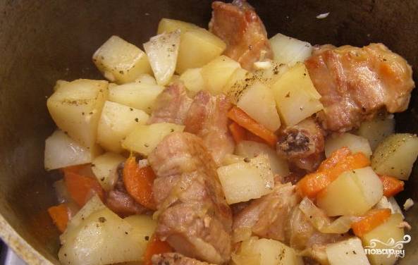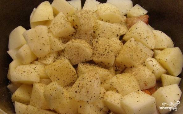 Картофель очистите, нарежьте небольшими кусочками и добавьте к мясу. Добавьте специи по вкусу и тушите все вместе еще 20-25 минут.