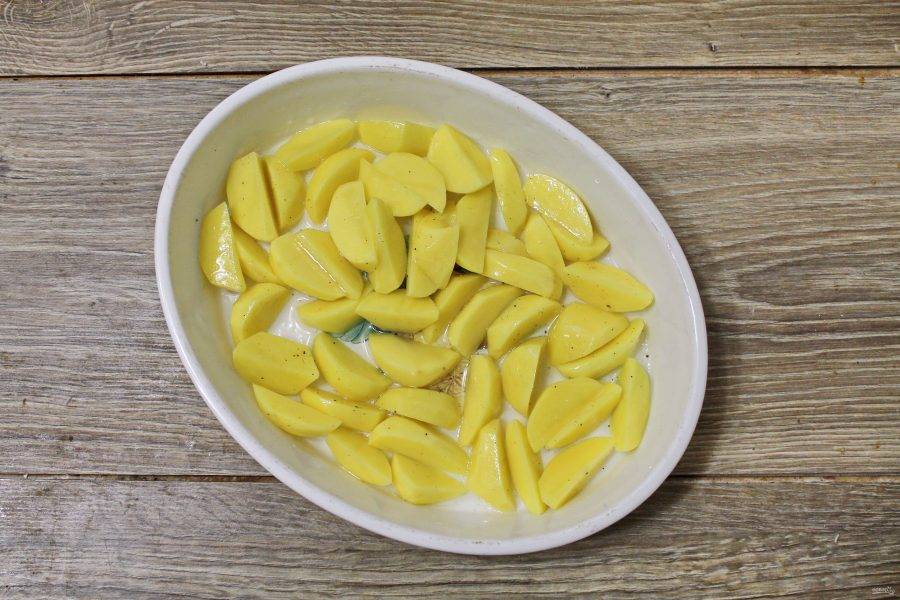 Картофель очистите, сполосните и порежьте поперек на дольки. Выложите картошку в форму для выпечки, посолите, поперчите, полейте растительным маслом и перемешайте.