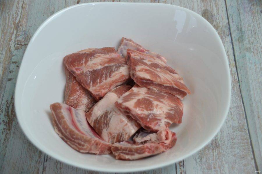 Нарежьте ребрышки на порционные кусочки.