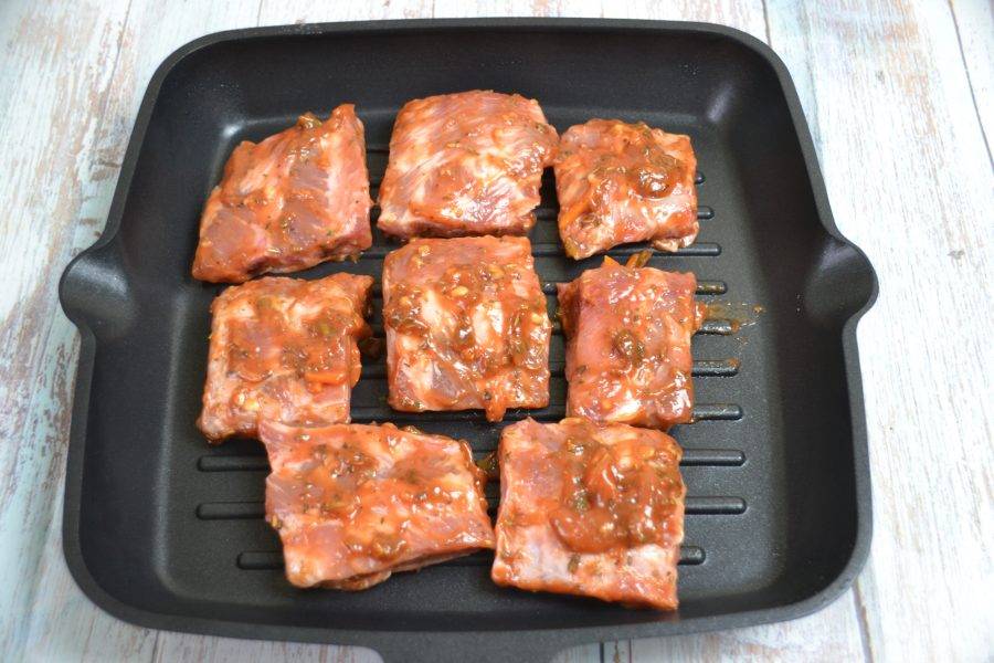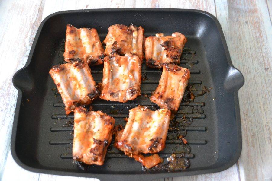 Выложите ребрышки на сковороду-гриль, поставьте в духовку для запекания при температуре 180 градусов.