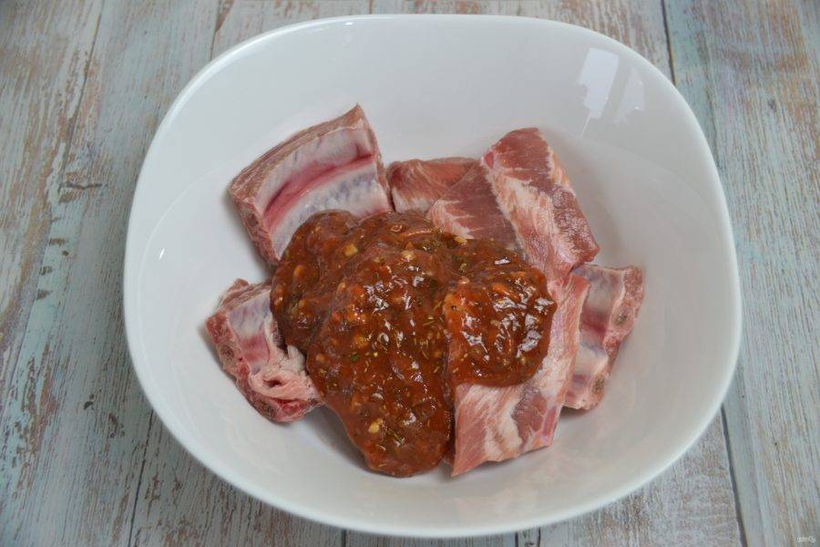 Выложите маринад к свиным ребрышкам, перемешайте, дайте немного настояться.