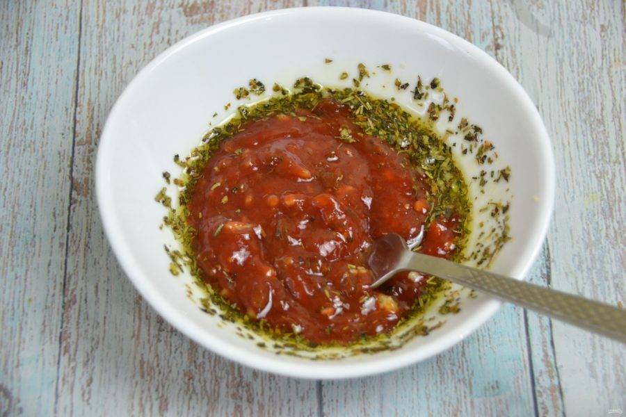 В миске смешайте пропущенный через пресс чеснок, добавьте сухие пряные травы, масло, щепотку соли.