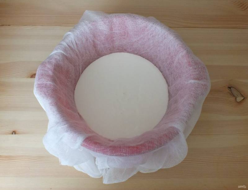 Возьмите дуршлаг, выстелите на него 4 слоя марли. Перелейте в него кефирно-сметанную массу.