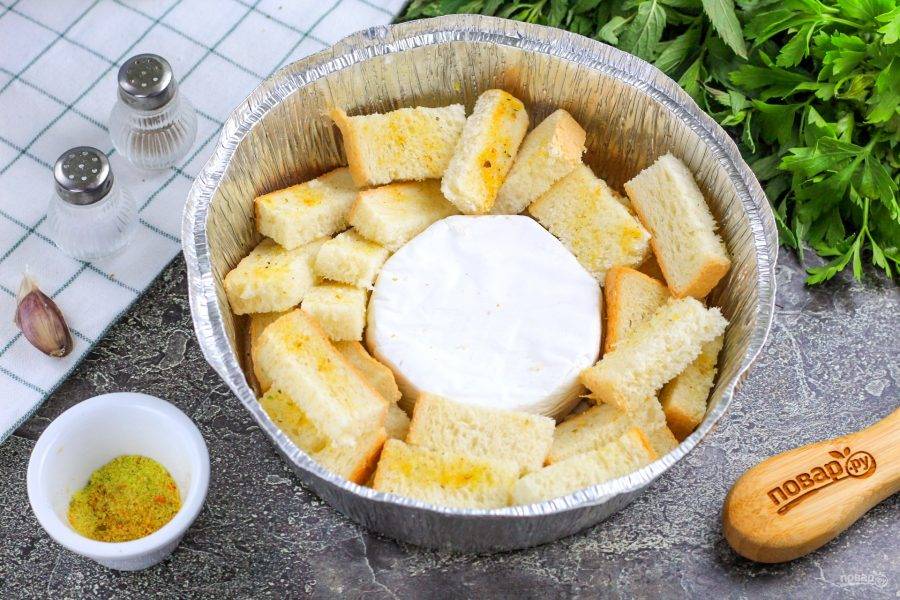 В фольгированную форму выложите сыр, если это Камамбер. Если решите использовать Моцареллу или Голландский сыр, то сначала его нужно будет натереть на терке и выложить в небольшую форму для запекания. Вокруг сыра выложите нарезанные ломтики хлеба.