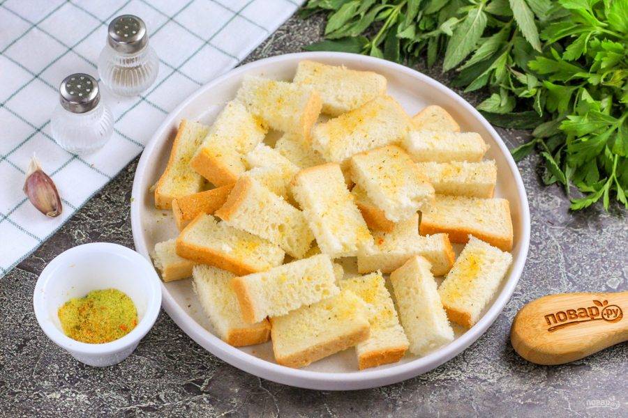 Хлеб нарежьте брусочками или кубиками по вашему вкусу.