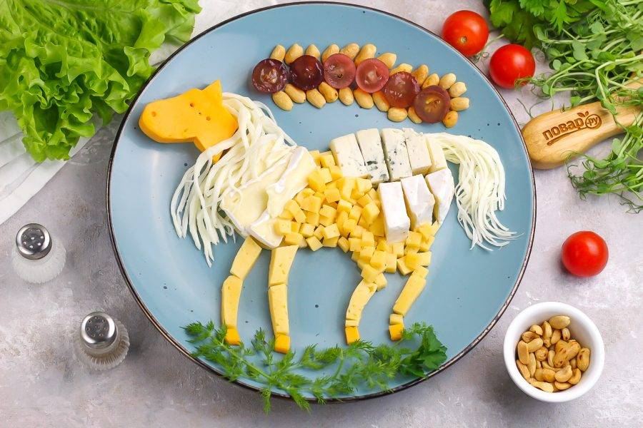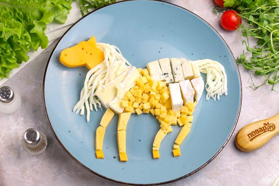 Нарежьте Дор Блю и Камамбер ломтиками, оставляя полукруглые хвостики и выложите в конец тарелки — это будет задняя часть лошадки. Остаток Камамбера нарежьте слайсами и выложите под голову — это будет шея.