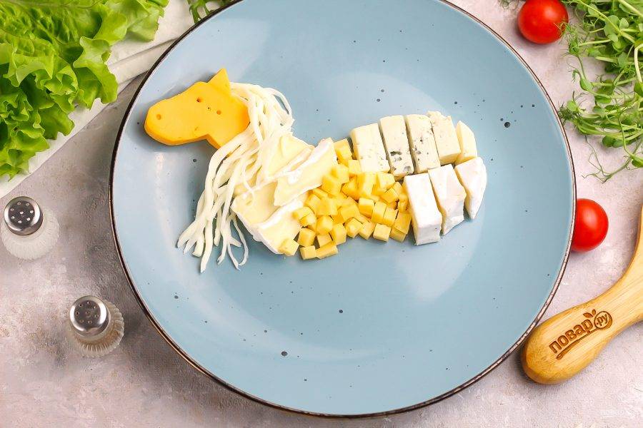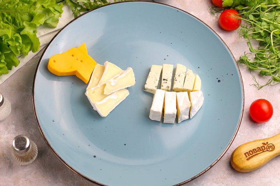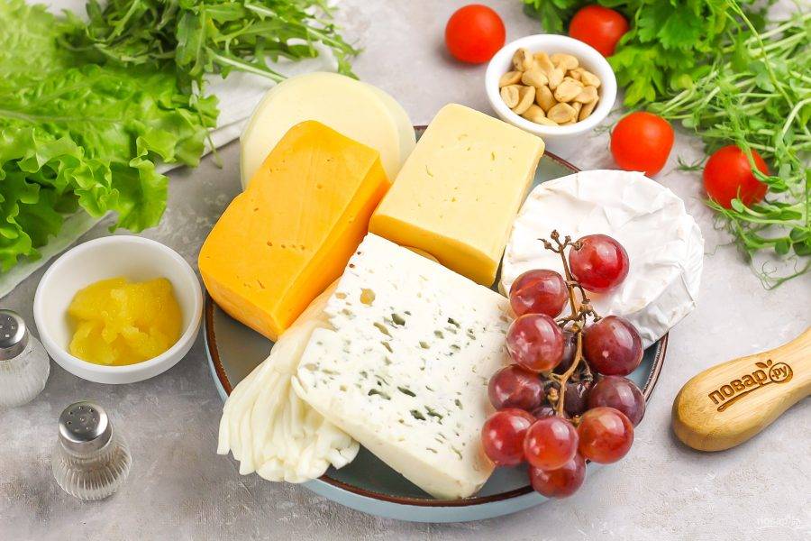 Подготовьте указанные продукты. Приобретите разные сорта сыров: Камамбер, Дор Блю, Сулугуни, Голландский и т.д. Орехи можно выбрать по вашему вкусу.