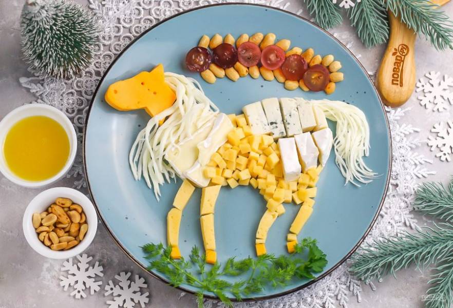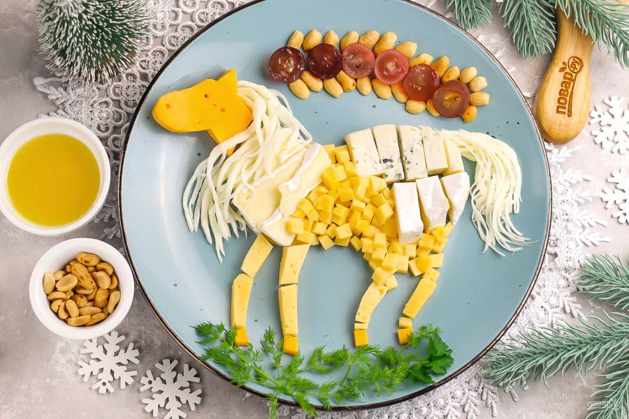 Замечательная новогодняя идея — приготовить сырную нарезку в виде лошади на Новый год! Подавайте ее с орехами, медом, виноградом и другими продуктами по вашему вкусу. Готовьте из разных сортов сыра.