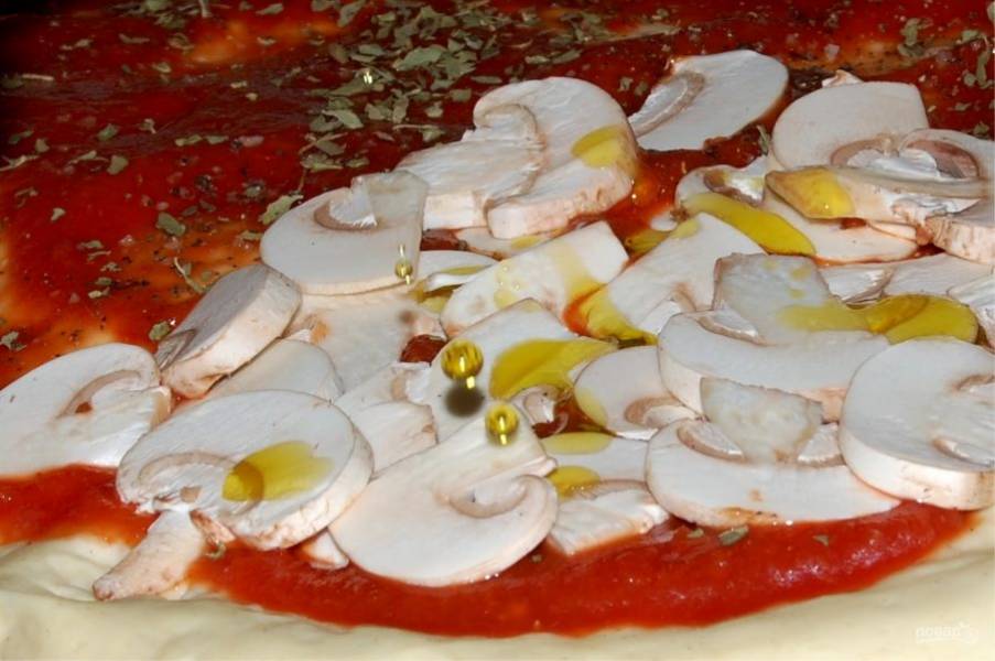 5. Условно разделите круглую основу на 4 части, выложите на одну сторону грибы, добавьте несколько капель оливкового масла.