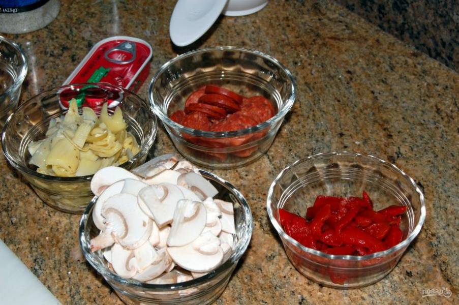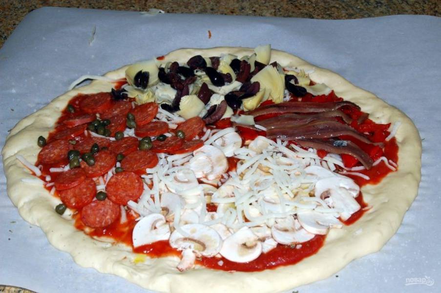 6. Оставшиеся части заполните: перцем и анчоусами, каперсами и пепперони, артишоками и оливками. Поверх всей начинки выложите сыр.