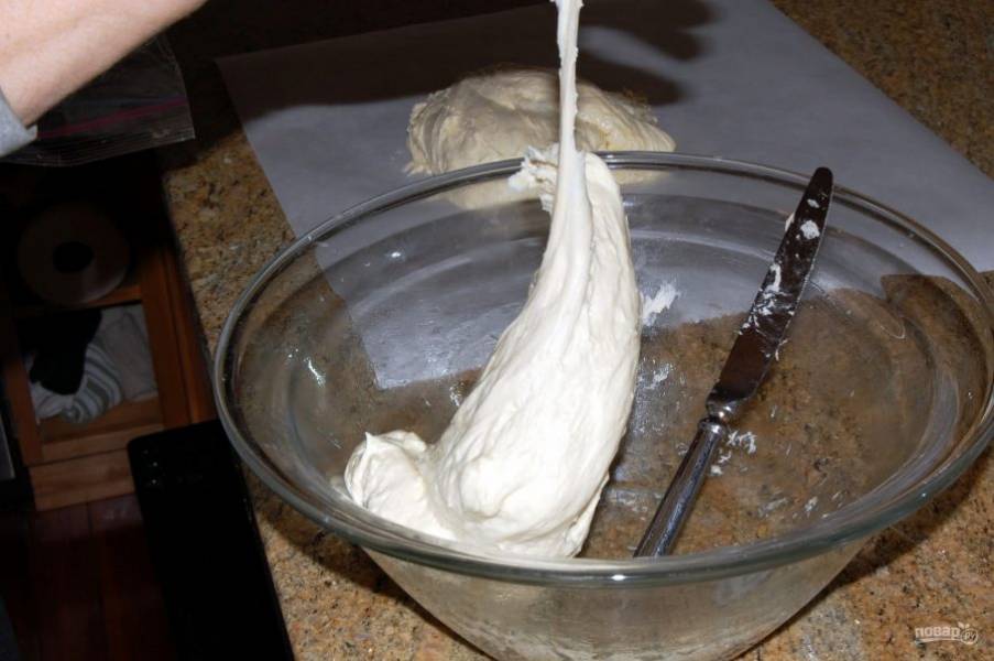 2. Спустя необходимое время разделите тесто на 2 части, одну уберите в морозилку (на хранение), а вторую раскатайте сперва руками, затем используйте скалку.
