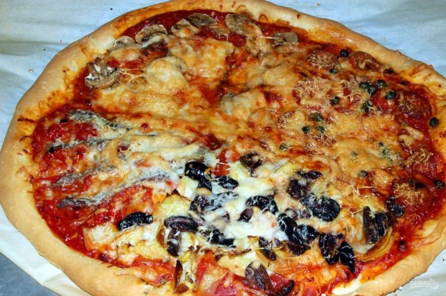 Расскажу, как приготовить пиццу "Четыре сезона", - это один из самых популярных видов. Очень удобно готовить такую, когда хочется попробовать несколько начинок, но не охота готовить их по отдельности.