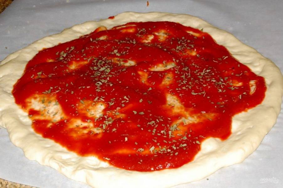 4. Смажьте основу для пиццы томатным соусом, добавьте базилик и орегано, посолите.