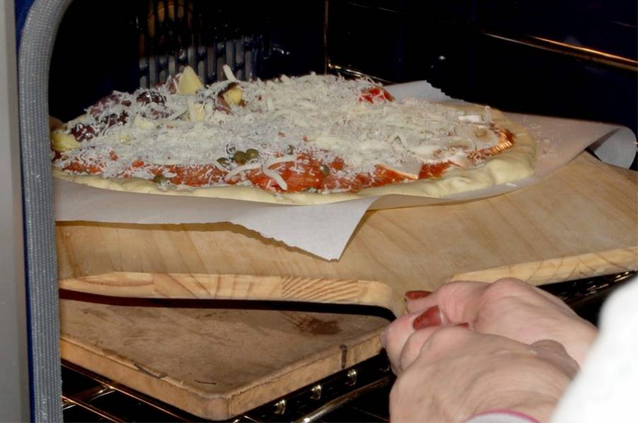 7. Выпекайте пиццу в разогретом до 220-230 градусов духовом шкафу до готовности.