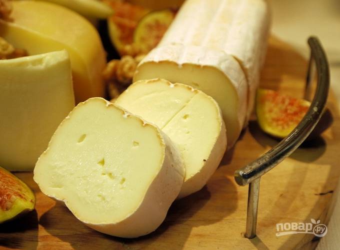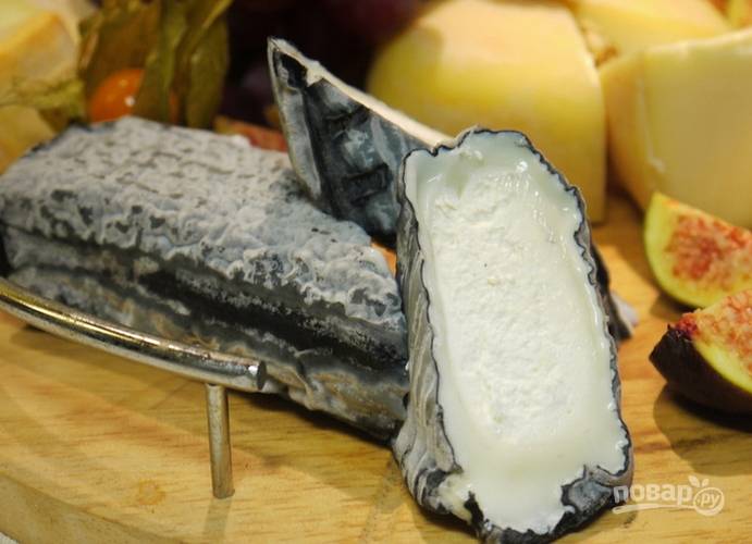 Нарежьте брусочками "Буше де шевре". Это козий сыр, с белой благородной плесенью. Вкус у него очень нежный, а запах слегка островатый.