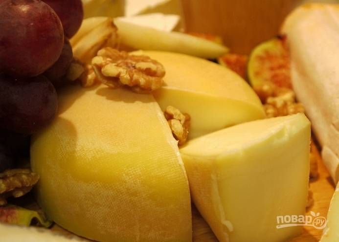 Выложите все нарезанные сорта сыра на деревянную тарелку. Вымойте фрукты и красиво их нарежьте. Дополните фруктами и орешками тарелку с сырами и подавайте их к столу.