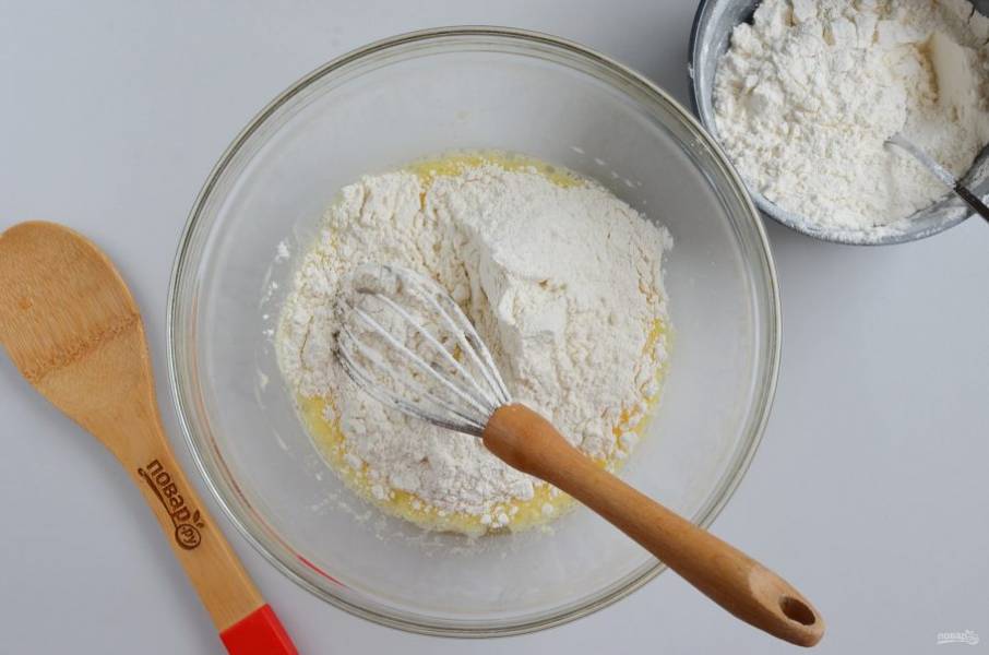 В молочно-яичную массу всыпьте мучную, венчиком перемешайте, чтобы не осталось комочков. Масса получается густоватая, так и должно быть.