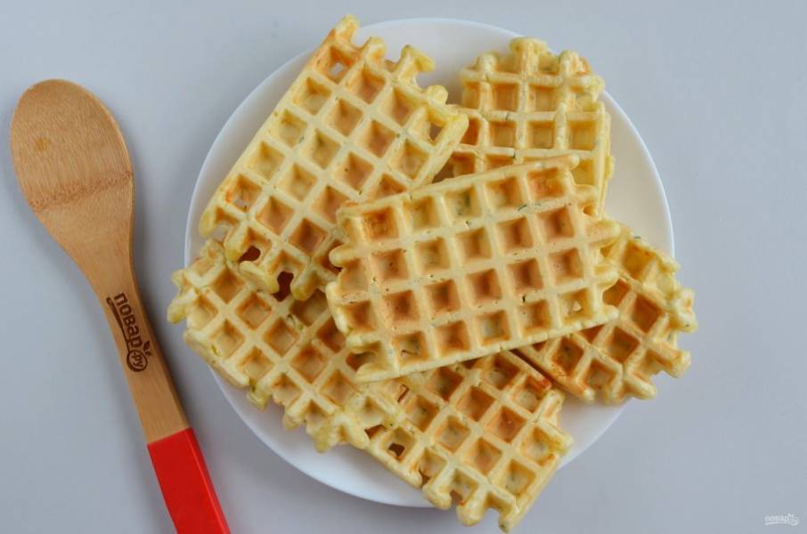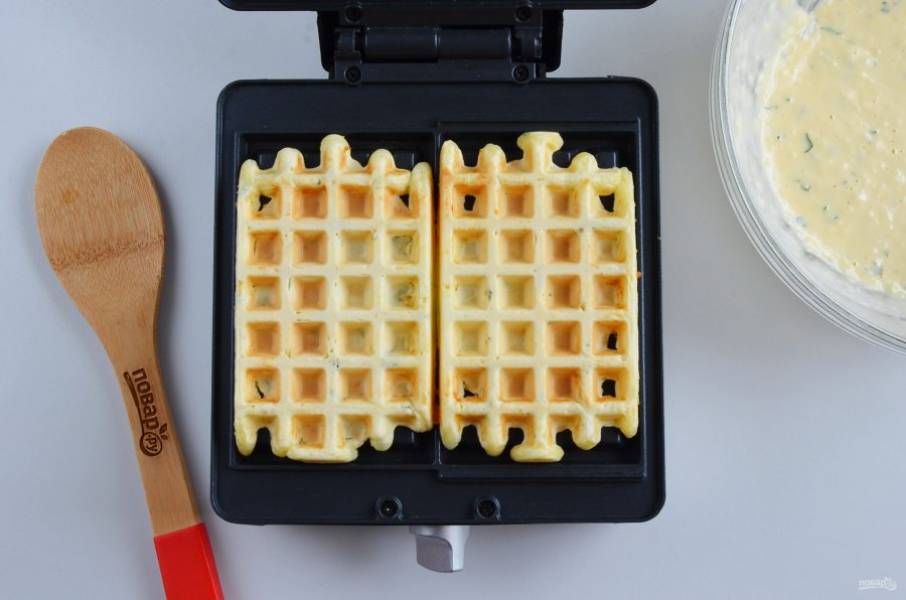 Закройте крышку вафельницы и жарьте пару минут вафельки до румяного цвета.