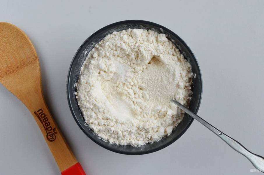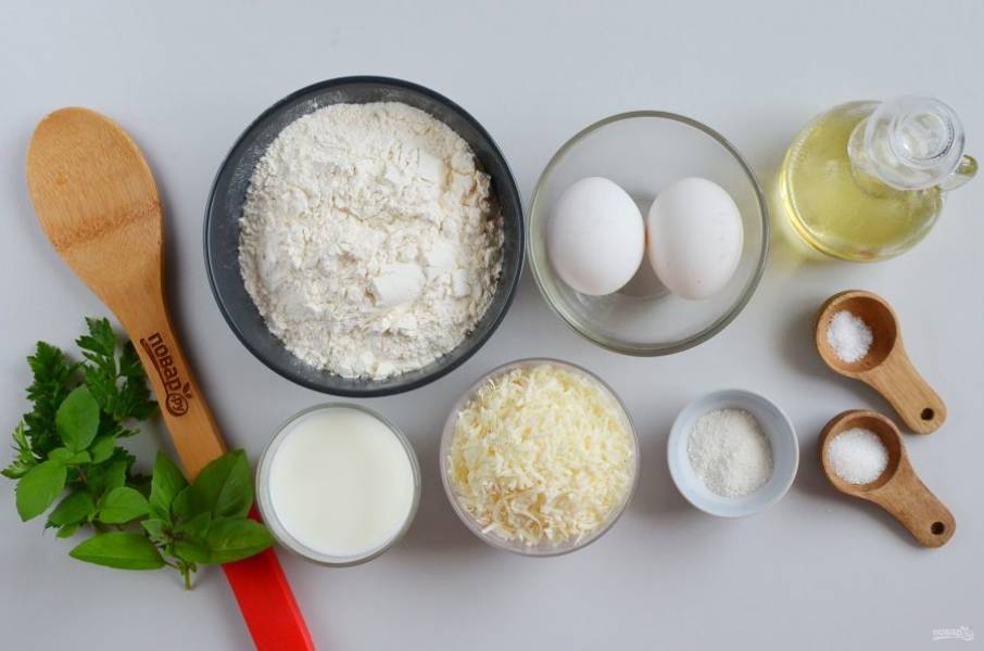 Муку смешайте с солью, сахаром, разрыхлителем. Если у вас нет весов, то 150 грамм — это примерно стакан (250 мл.) с горкой. Объем тертого сыра тоже примерно стакан с горкой.