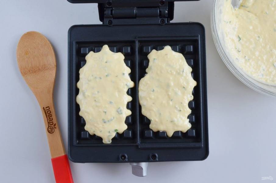 Разогрейте вафельницу, если у вас антипригарная, то смазывать ее не нужно, тем более что в составе теста есть растительное масло, прилипать ничего не будет. Если вафельница, как у меня, то на каждую половинку выложите по 2 ст.л. теста. Если вафельница квадратная (из 4 квадратиков), то по 1 ст.л. будет в самый раз.