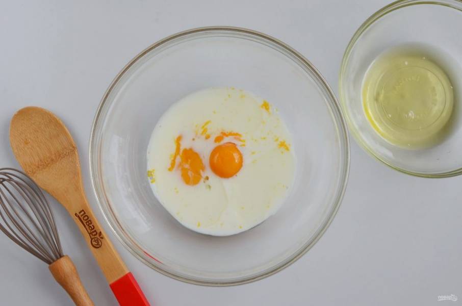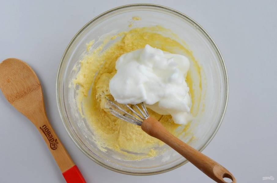 Куриные яйца разделите на желтки и белки. Желтки в большой миске соедините с молоком и растительным маслом. А белки взбейте в другой миске до пышной устойчивой пены.