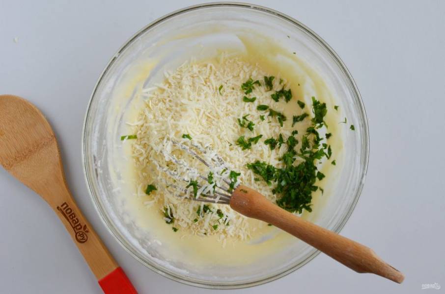 Добавьте тертый сыр и мелко рубленую зелень (базилик и петрушку, можно базилик и укроп, или просто что-то одно).