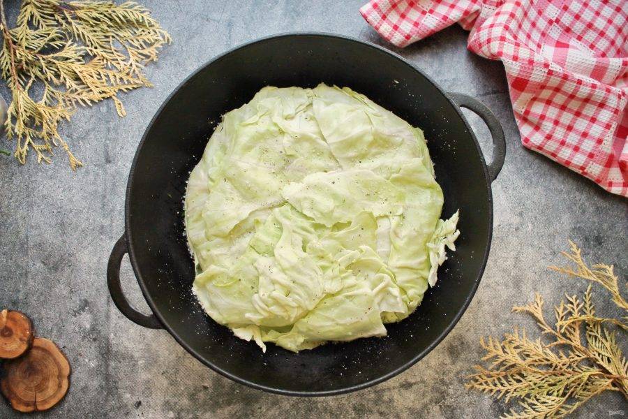 Закройте все сверху листьями капусты и закройте крышкой или плотной алюминиевой фольгой.