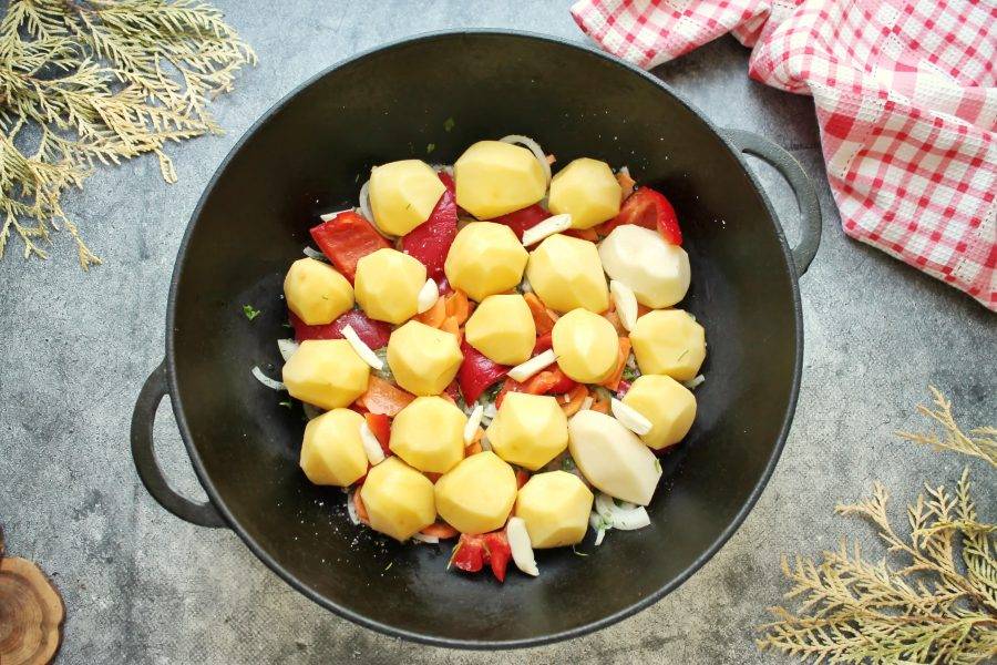 Очищенный картофель разрежьте пополам и выложите поверх овощей. Чеснок разрежьте на несколько частей и разложите по картофелю, посолите.