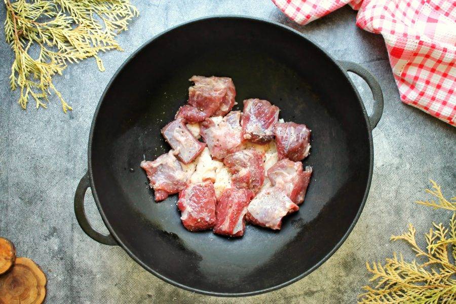 На дно казана выложите порезанное сало. Баранину сполосните, обсушите и порежьте крупными кусками. Выложите мясо поверх сала, посолите и поперчите.