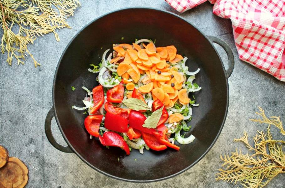 Морковь порежьте полукольцами, болгарский перец крупными кусками и выложите на репчатый лук. Добавьте лавровый лист и душистый перец.