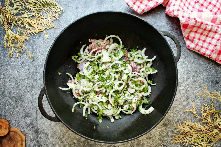 Очищенный репчатый лук порежьте полукольцами. Зелень мелко порежьте, смешайте с репчатым луком и выложите на мясо.