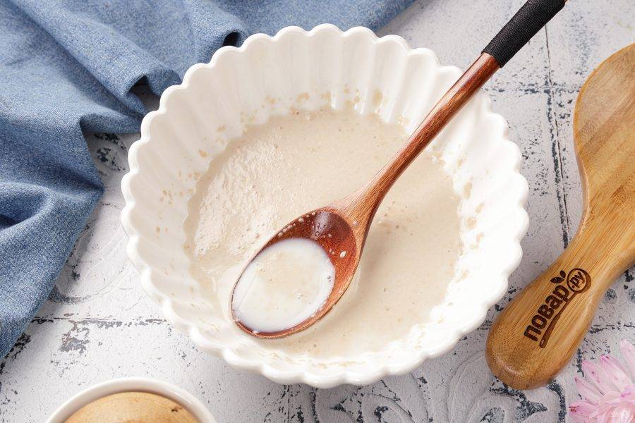 Соедините тёплое молоко и дрожжи. Добавьте 1 ч.л. сахара, перемешайте и оставьте на 10 минут.